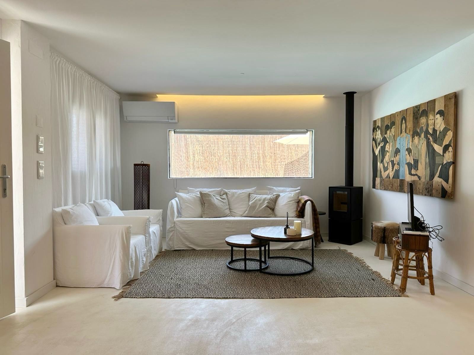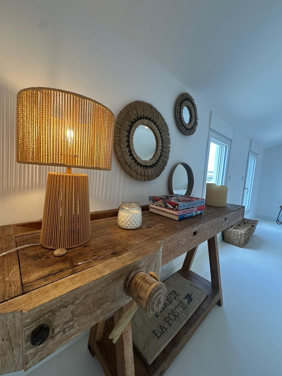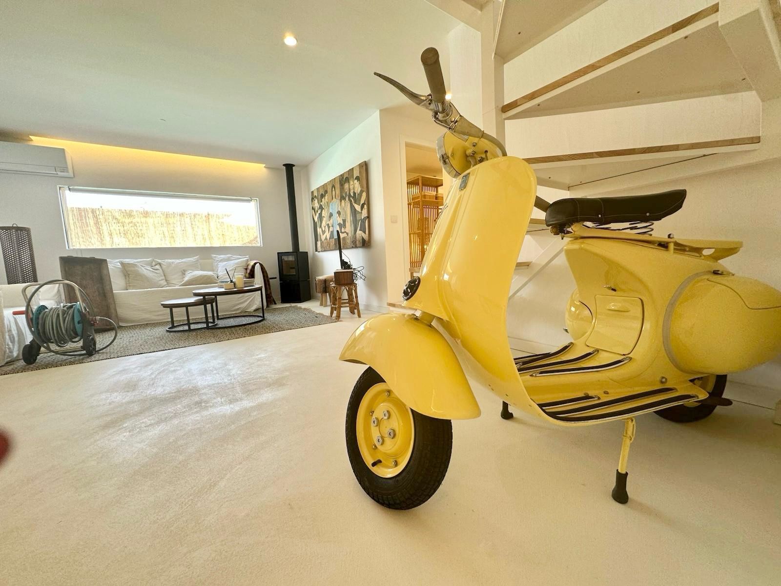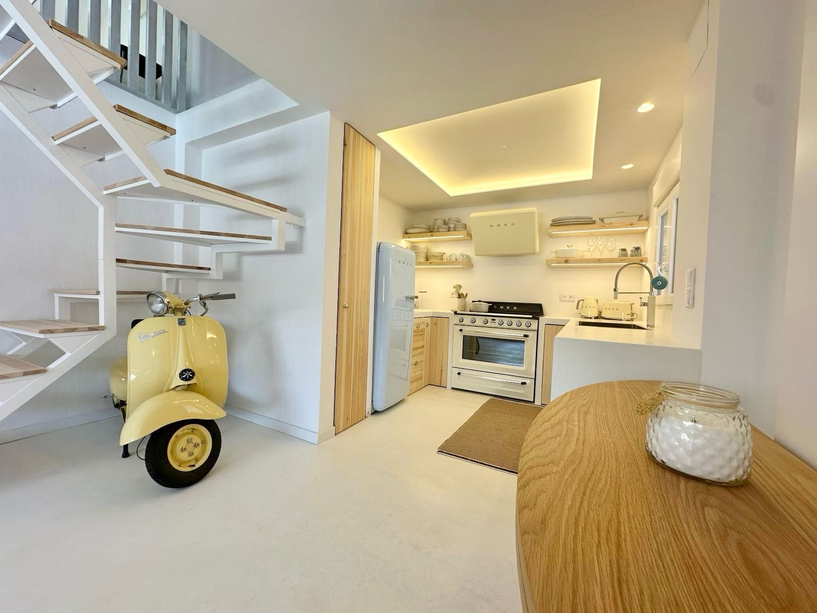 La maison, d'une superficie d'environ 140 m², est répartie sur deux niveaux. Le rez-de-chaussée comprend deux suites, une salle de bains pour les invités, un salon et une cuisine. Cette dernière est entièrement équipée d'appareils Smeg vintage série 50, dont un four de 90 cm avec plaque à induction et tiroir chauffant. Les finitions sont en microciment et en pin naturel.