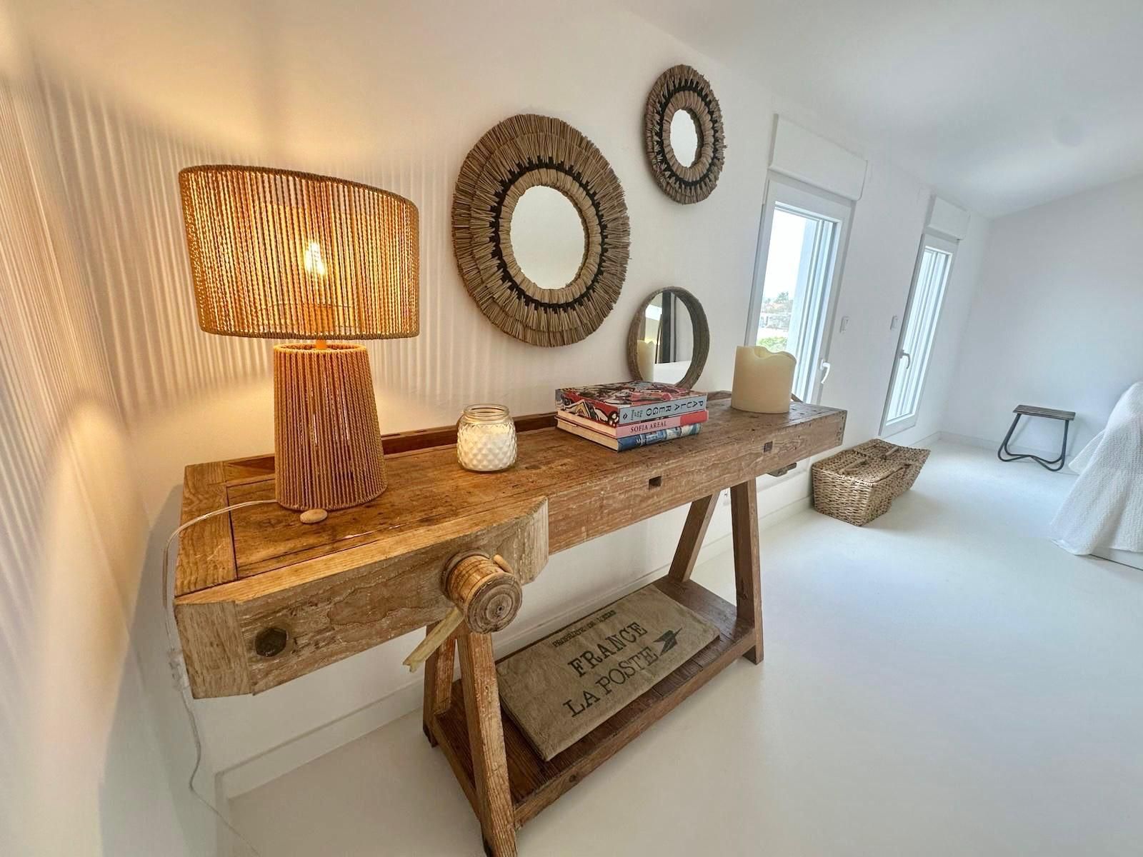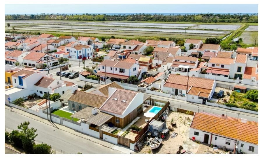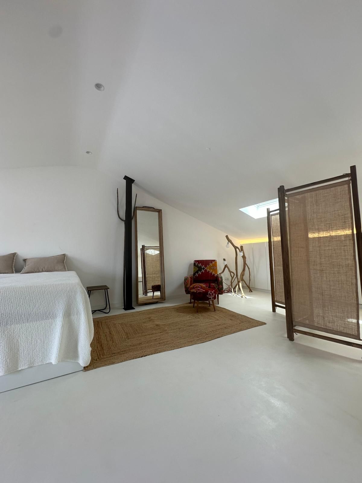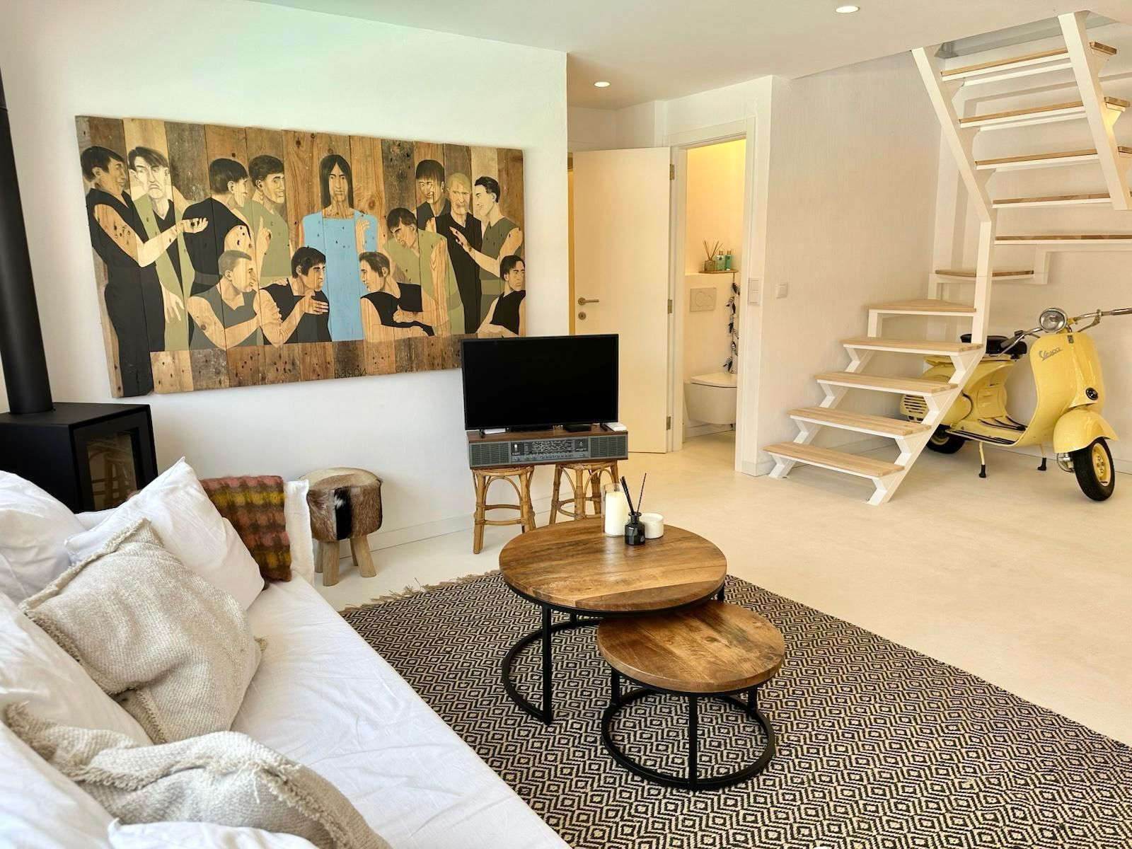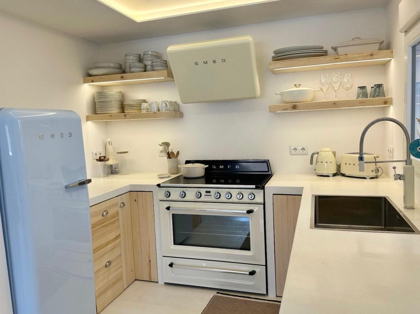 La maison, d'une superficie d'environ 140 m², est répartie sur deux niveaux. Le rez-de-chaussée comprend deux suites, une salle de bains pour les invités, un salon et une cuisine. Cette dernière est entièrement équipée d'appareils Smeg vintage série 50, dont un four de 90 cm avec plaque à induction et tiroir chauffant. Les finitions sont en microciment et en pin naturel.