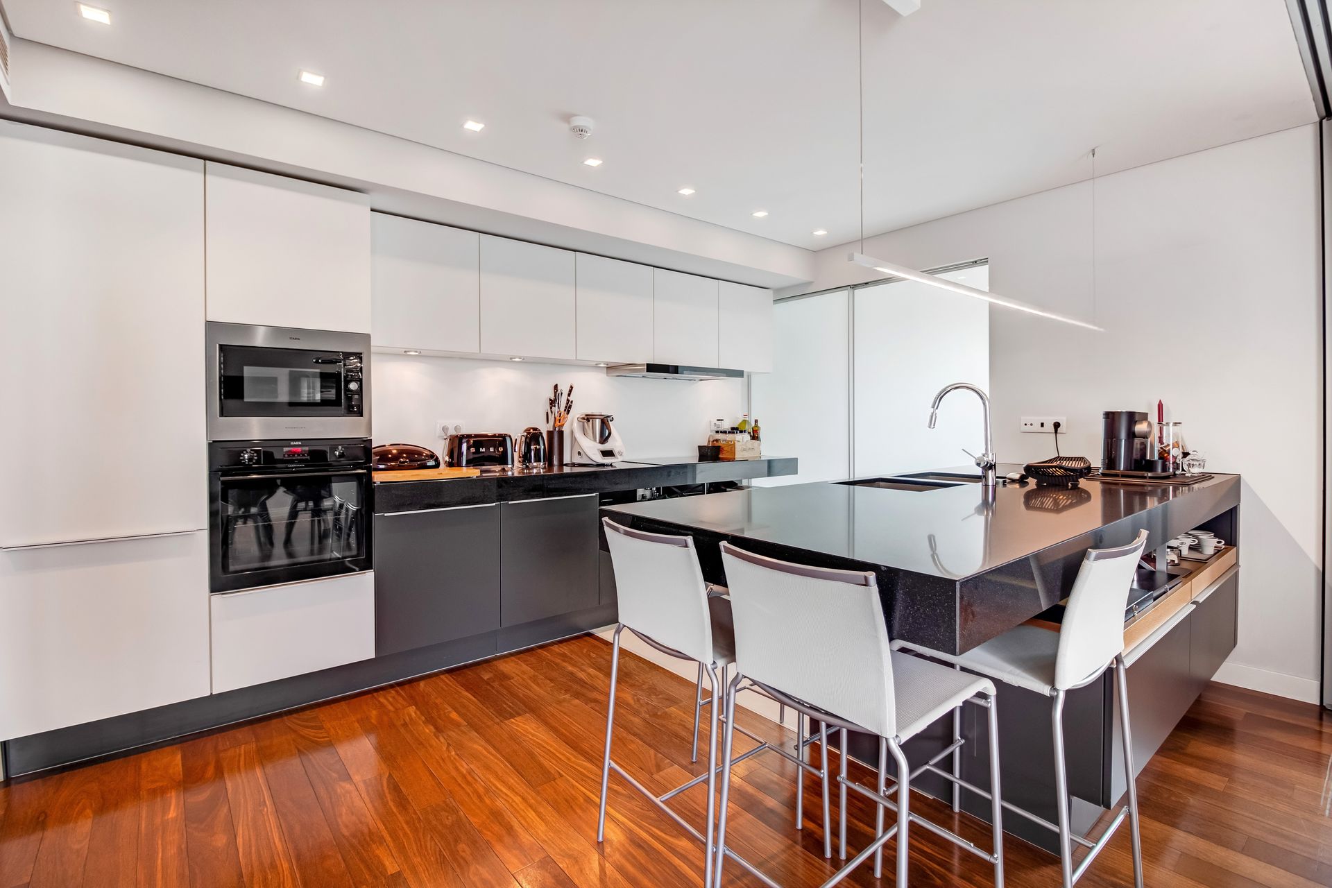A cozinha extremamente funcional e dinâmica tem duas zonas, uma área de serviço e um quarto de empregada com casa de banho. Poderá estar integrada com a sala de refeições ou ser independente, tudo isto pode ser transformado em vários ambientes graças a sua decoração estratégica com portas de correr em vidro italiano.