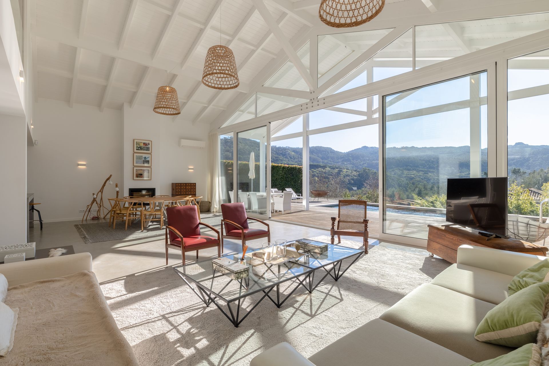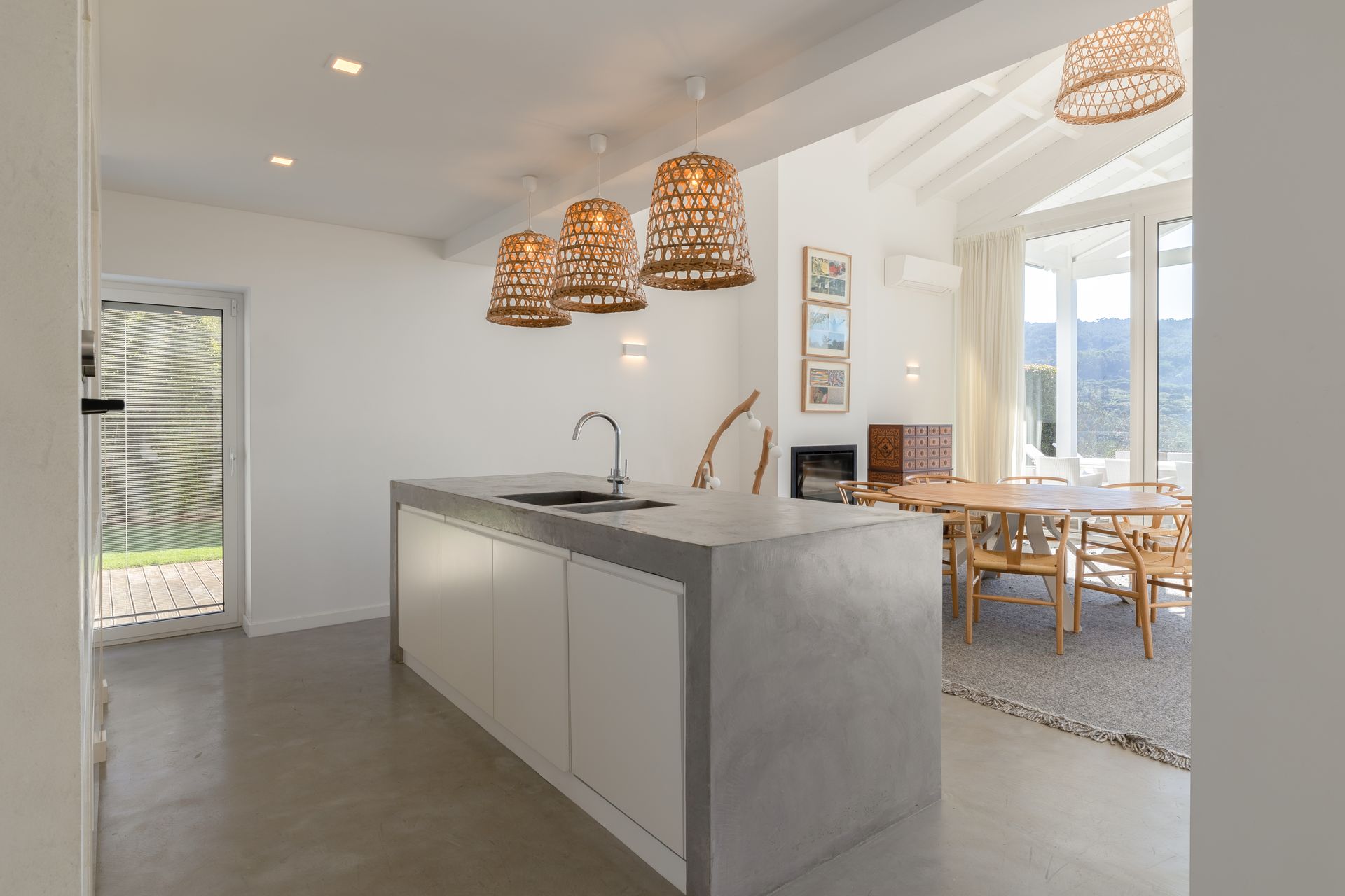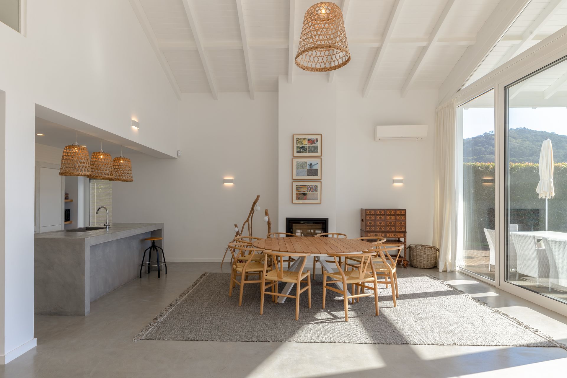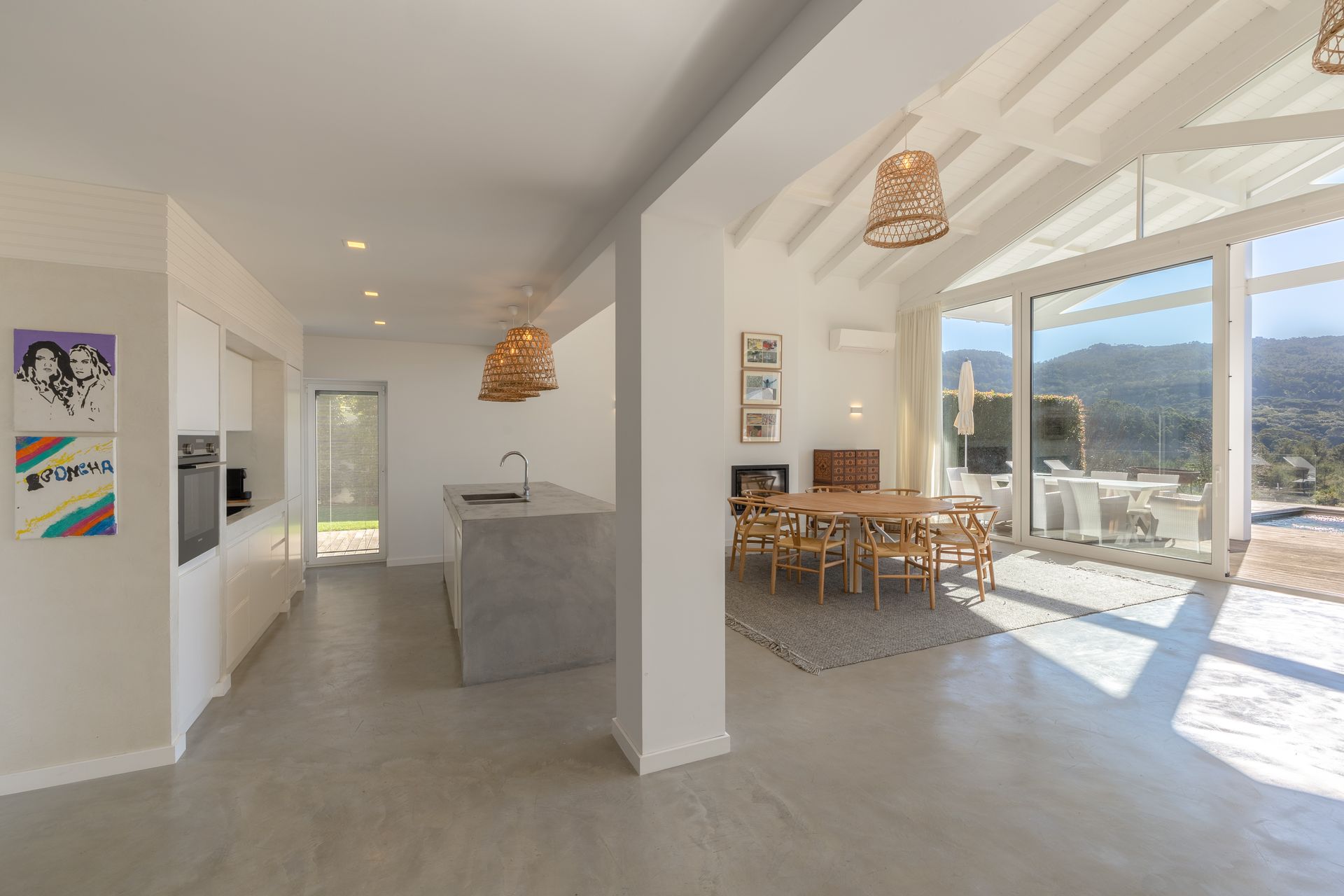Na cozinha encontra uma ilha funcional e epaço de balcão com máquina de lavar e secar roupa, máquina de louça ambas Samsung, frigorífico de encastre, placa e ainda filtro de água no lavatório. Por toda a casa os cabamentos são de qualidade referindo o chão em microcimetno, ar condicionado em todas as divisões e lareira com recuperador de calor. No piso superior temos uma suite ampla com vista para a sala e para a paisagem uma vez que está em forma de mezzanine com a sala para favorecer a vista e a claridade. Existe também uma zona consideravél de aproveitamento de espaço transformada em arrumos.