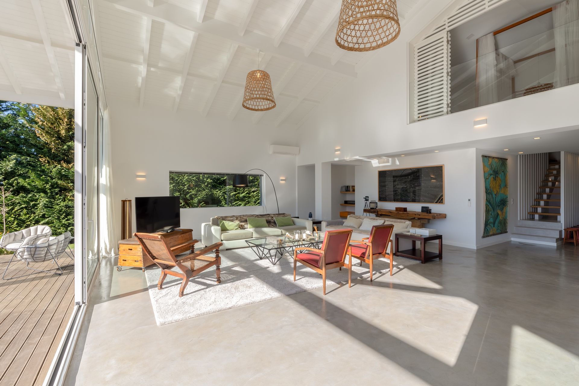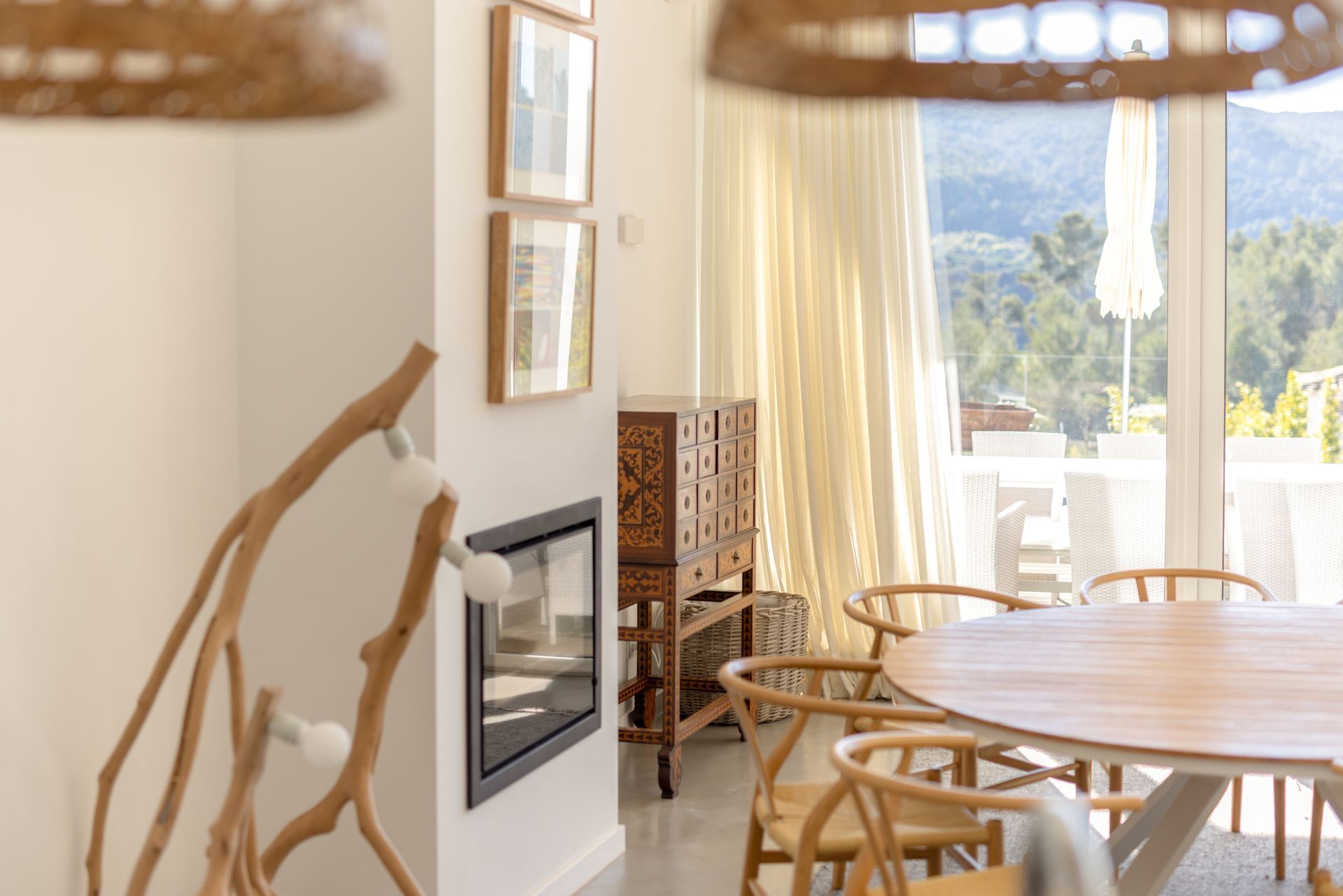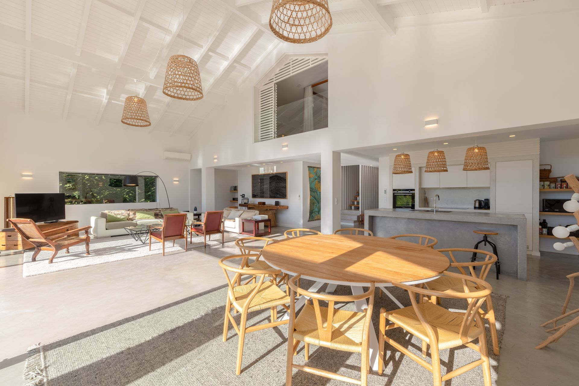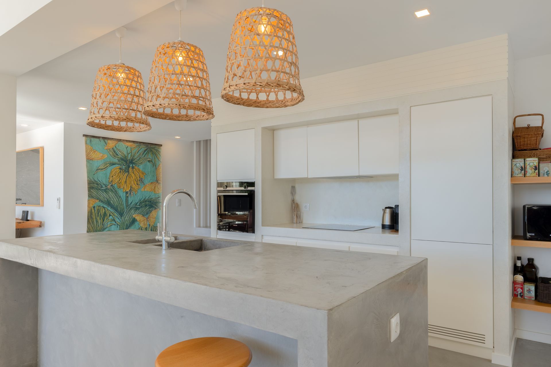 Na cozinha encontra uma ilha funcional e epaço de balcão com máquina de lavar e secar roupa, máquina de louça ambas Samsung, frigorífico de encastre, placa e ainda filtro de água no lavatório. Por toda a casa os cabamentos são de qualidade referindo o chão em microcimetno, ar condicionado em todas as divisões e lareira com recuperador de calor. No piso superior temos uma suite ampla com vista para a sala e para a paisagem uma vez que está em forma de mezzanine com a sala para favorecer a vista e a claridade. Existe também uma zona consideravél de aproveitamento de espaço transformada em arrumos.