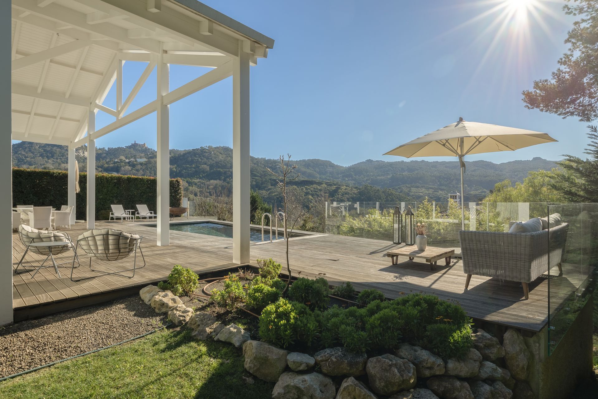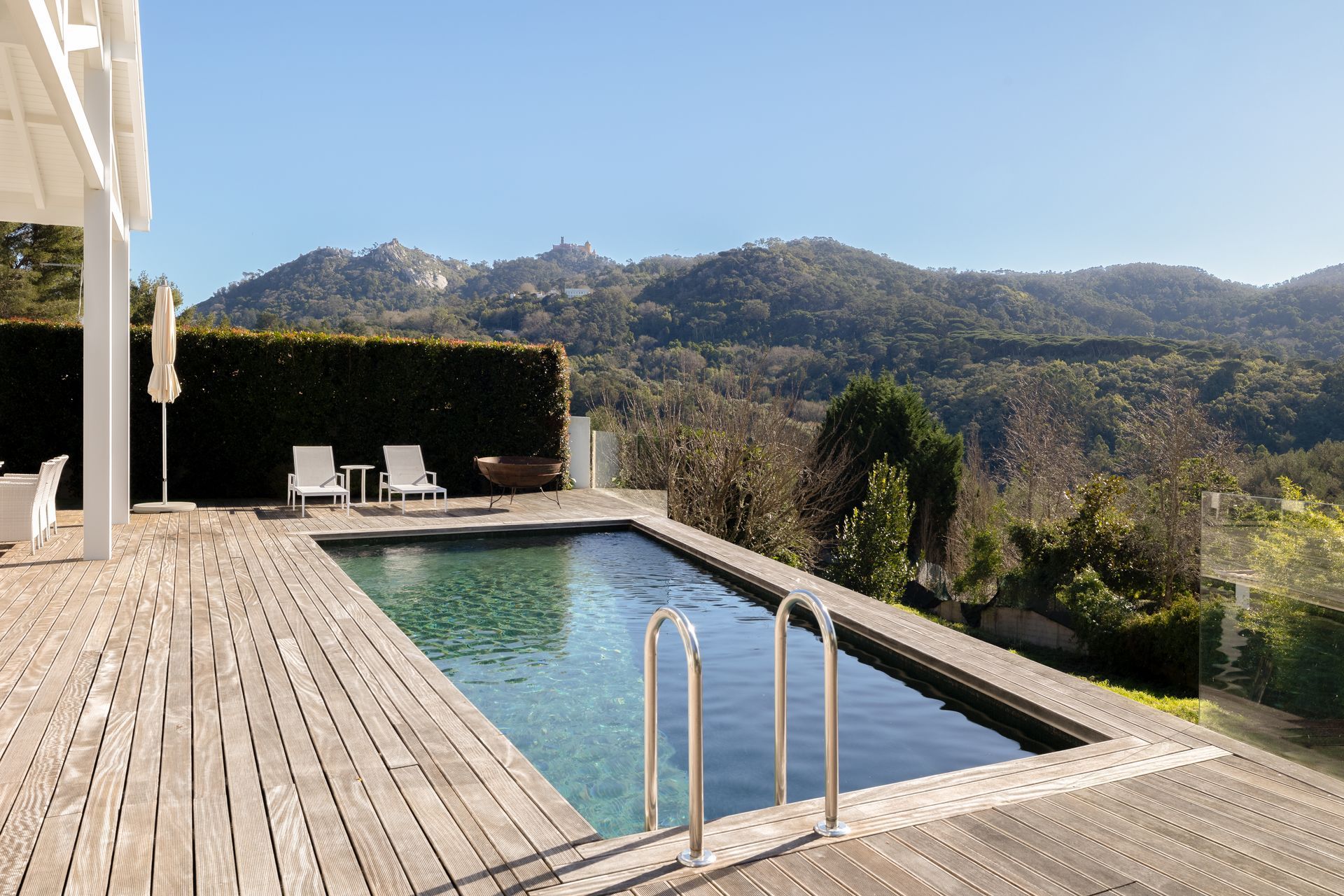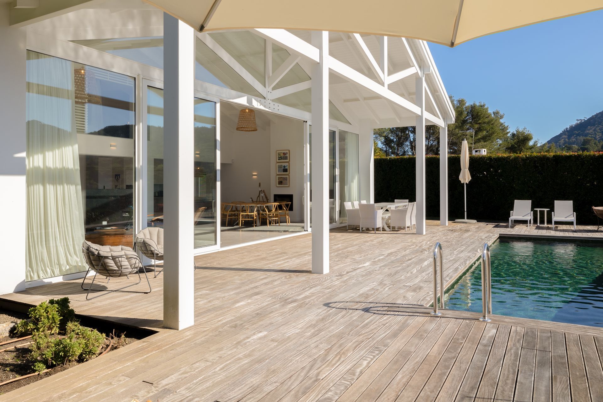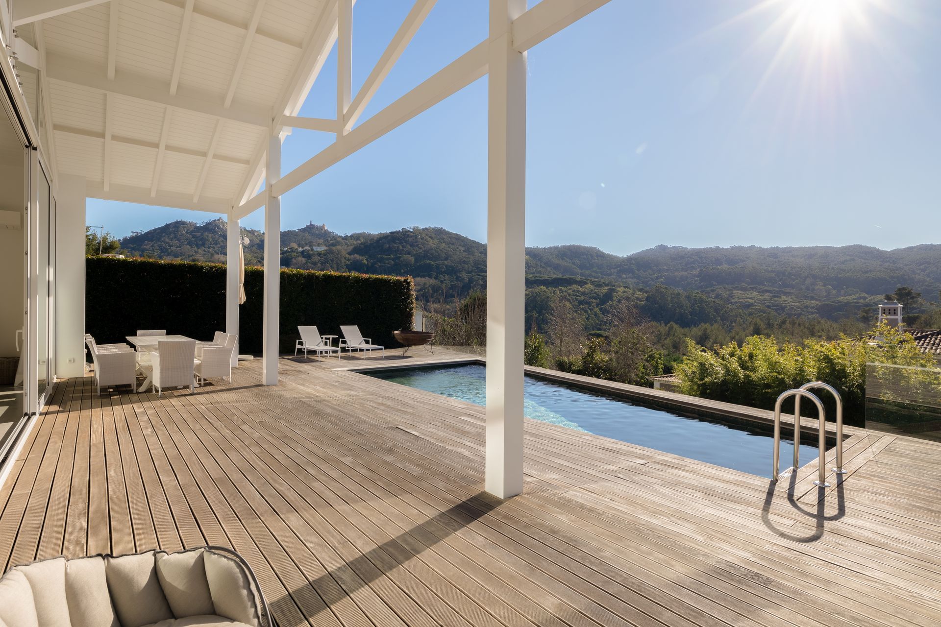 No exterior a piscina é aquecida e podemos contar com uma zona de refeiçoes e zona de estar em deck de madeira natural. Toda esta zona é também virada a sul.