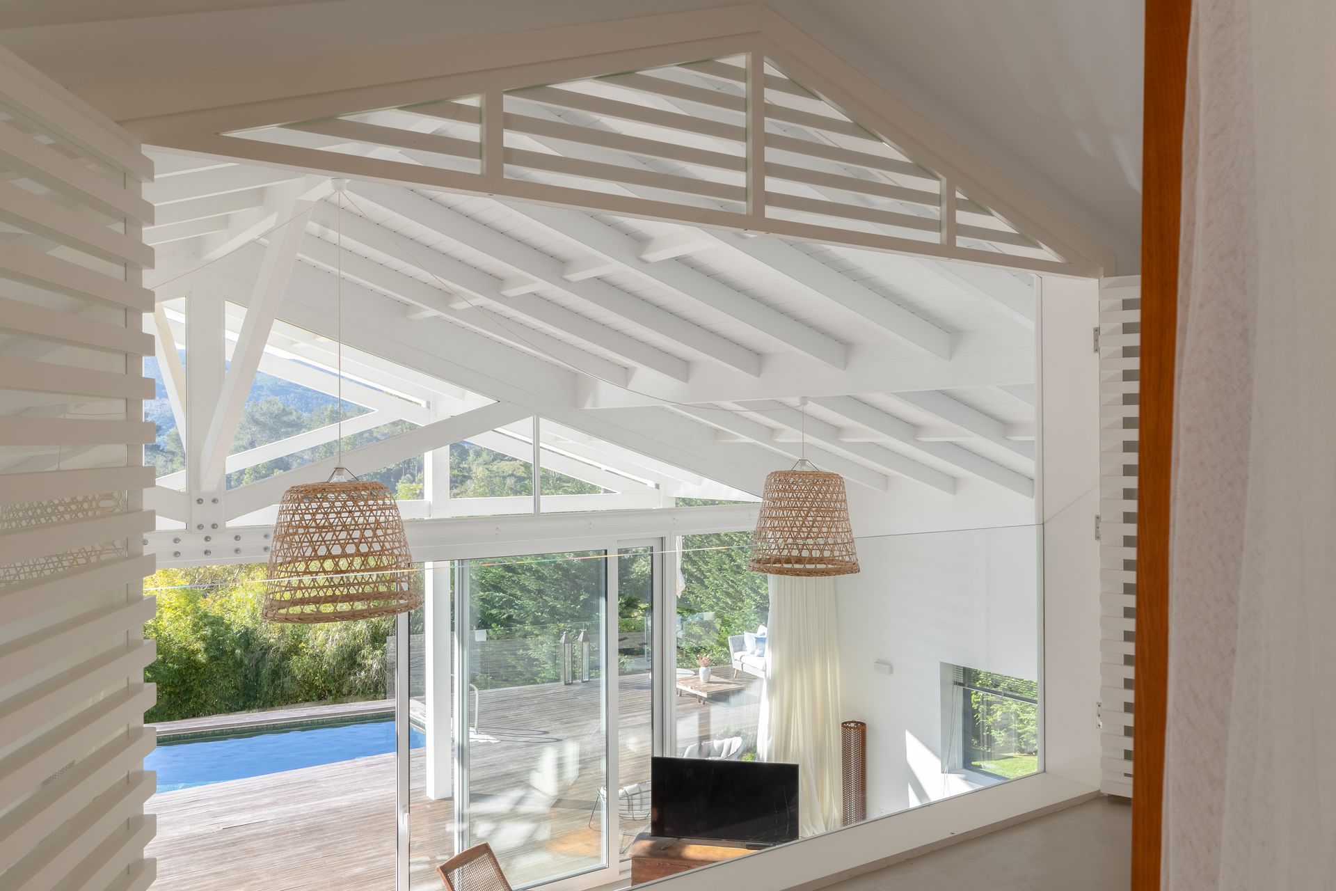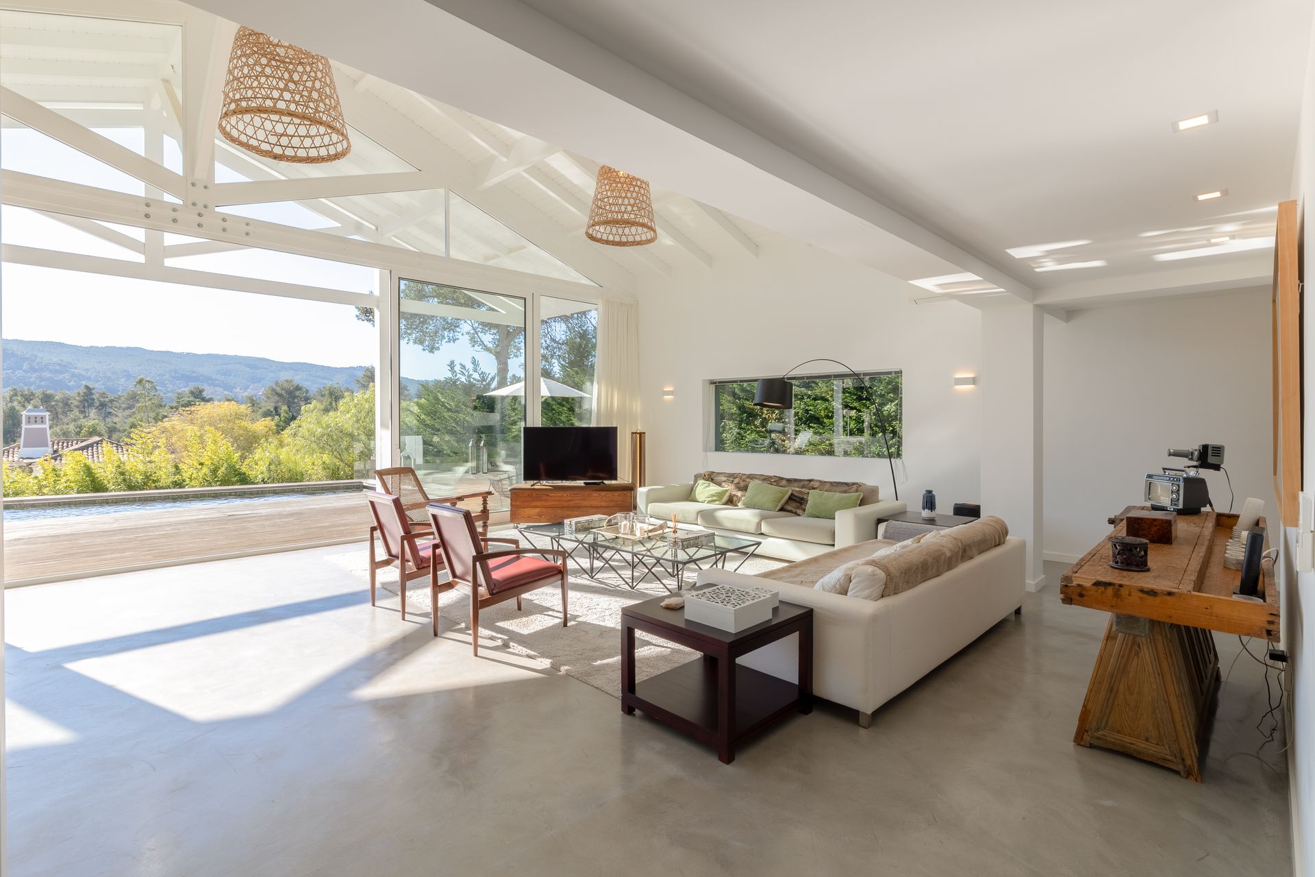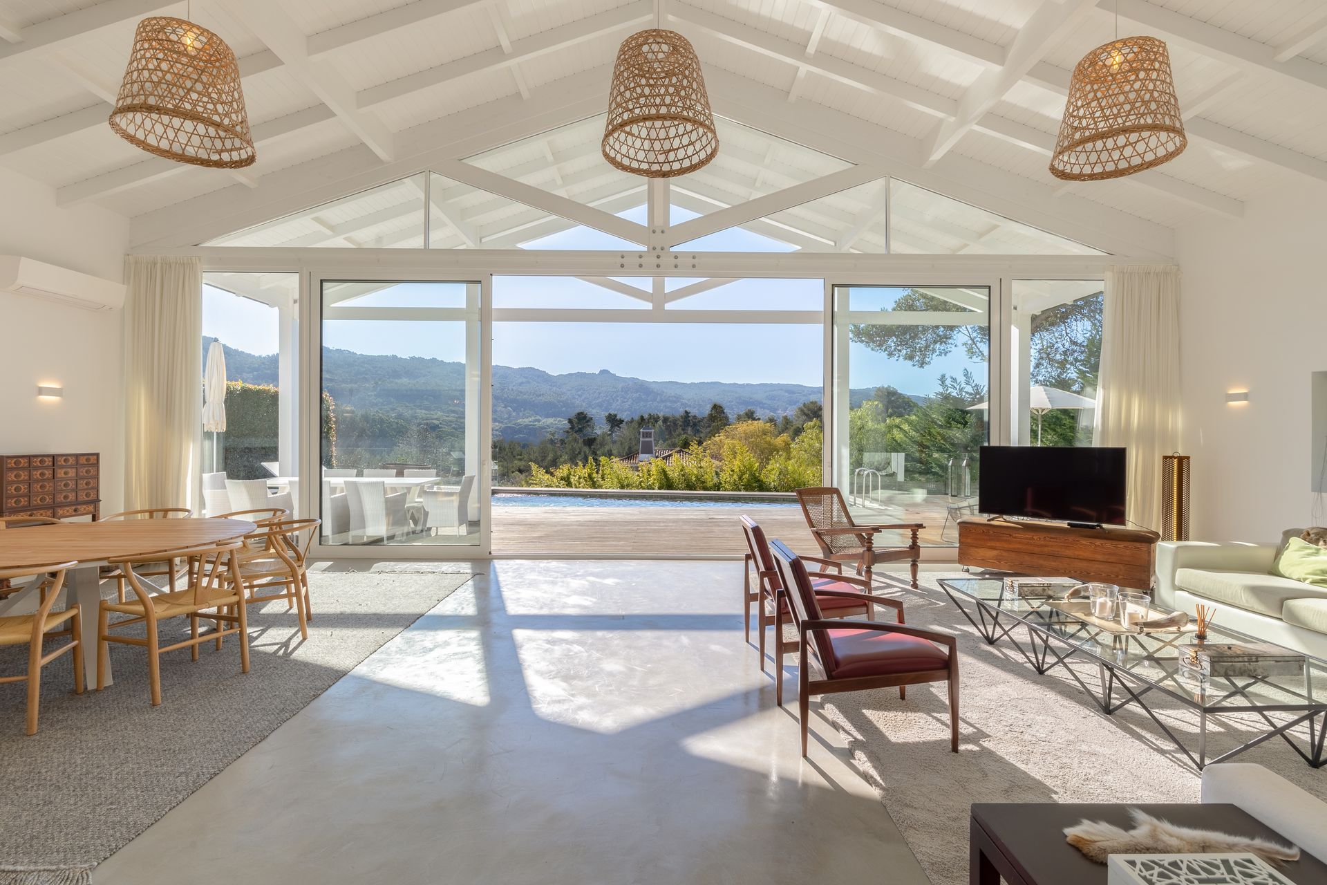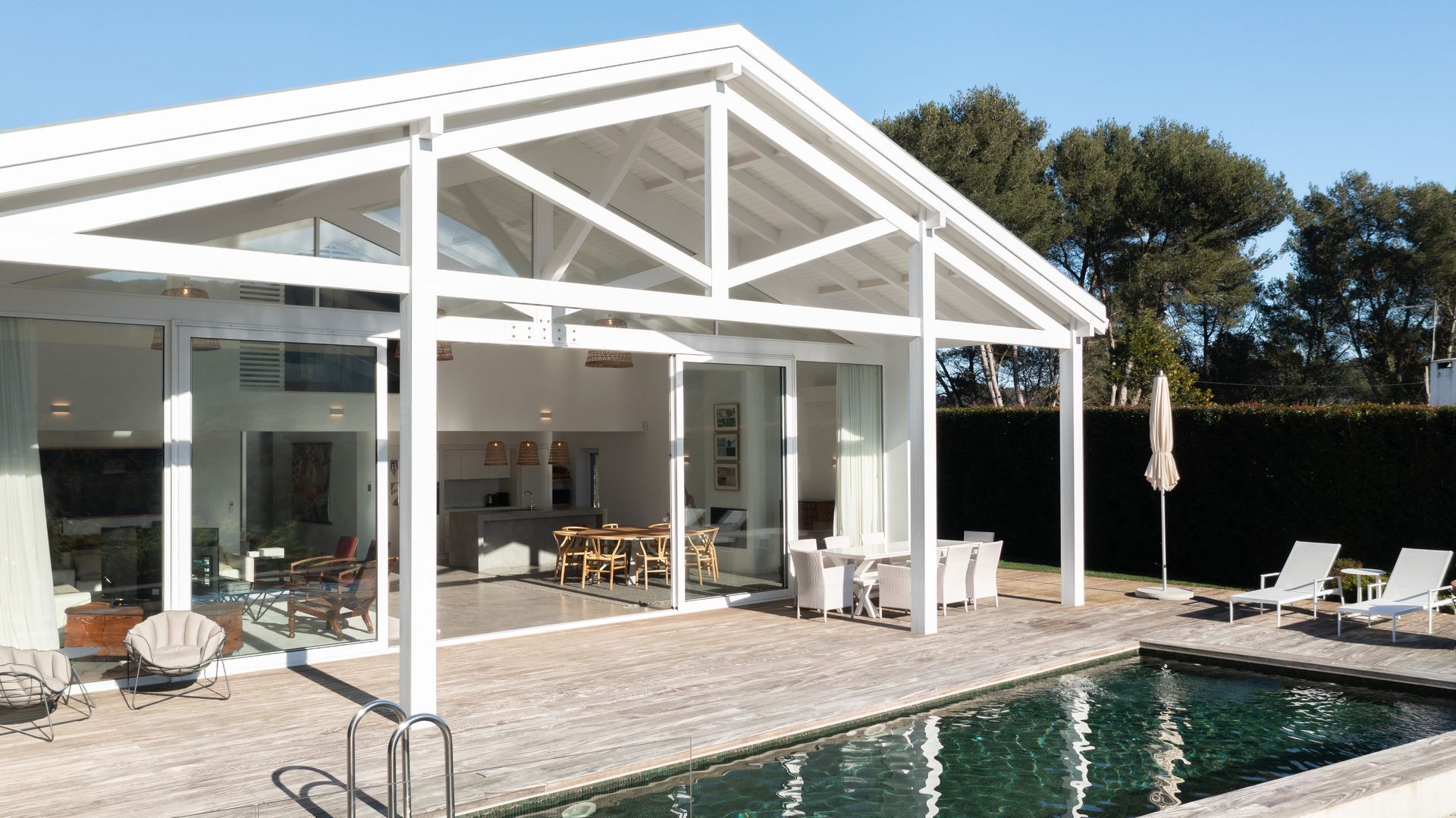 No exterior a piscina é aquecida e podemos contar com uma zona de refeiçoes e zona de estar em deck de madeira natural. Toda esta zona é também virada a sul.